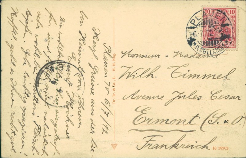 Alte Ansichtskarte aus Plauen, gelaufen am 06.07.1912 von Plauen (Vogtland) nach Ermont.
