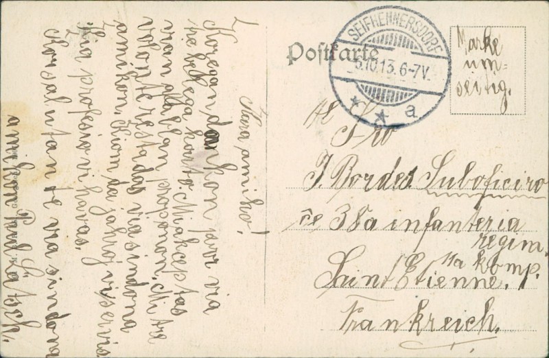 Alte Ansichtskarte aus Seifhennersdorf, gelaufen am 06.10.1913 von Seifhennersdorf nach Saint Etienne.