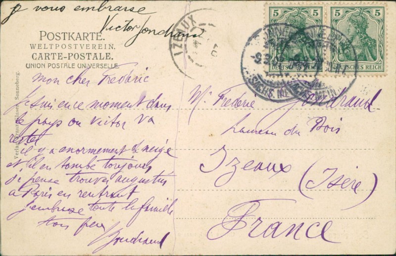 Alte Ansichtskarte aus Sonneberg, gelaufen am 09.03.1907 von Sonneberg nach Izeaux.