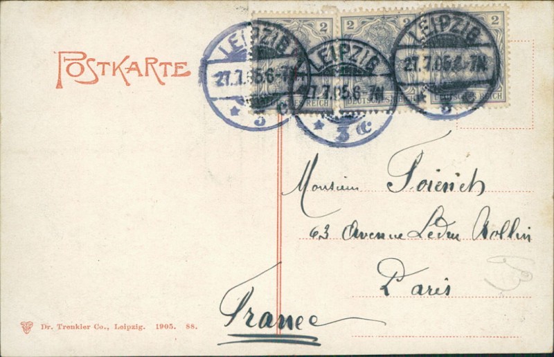 Alte Ansichtskarte aus Leipzig, gelaufen am 27.07.1905 von Leipzig nach Paris.