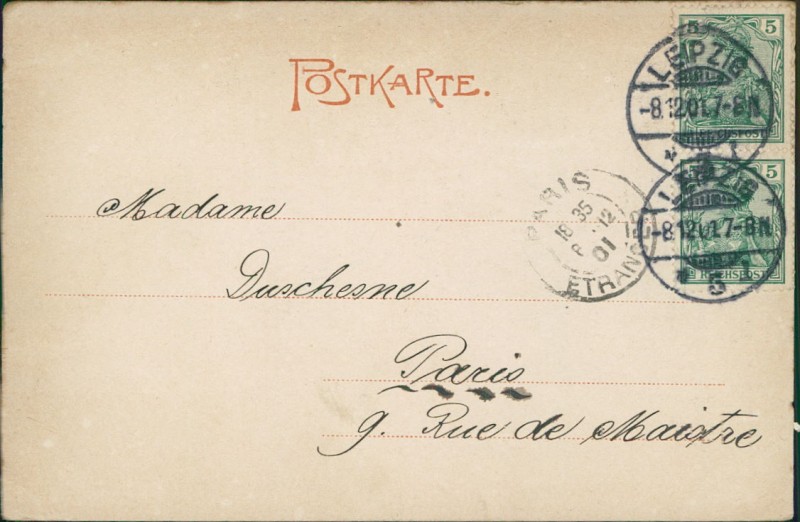 Alte Ansichtskarte aus Leipzig, gelaufen am 08.12.1901 von Leipzig nach Paris.
