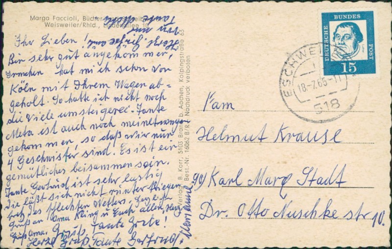 Alte Ansichtskarte aus Eschweiler-Weisweiler, gelaufen am 18.07.1965 von Eschweiler nach Karl Marx Stadt.