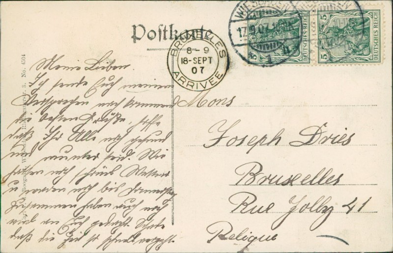 Alte Ansichtskarte aus Wiesbaden, gelaufen am 17.09.1907 von Wiesbaden nach Bruxelles.