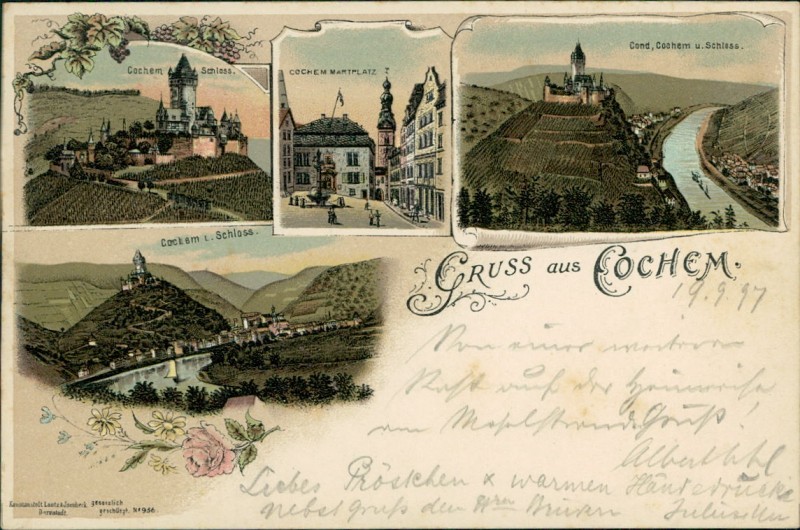 Alte Ansichtskarte aus Cochem, gelaufen am 13.09.1897 von Cochem nach Dieuze (Lothr.).