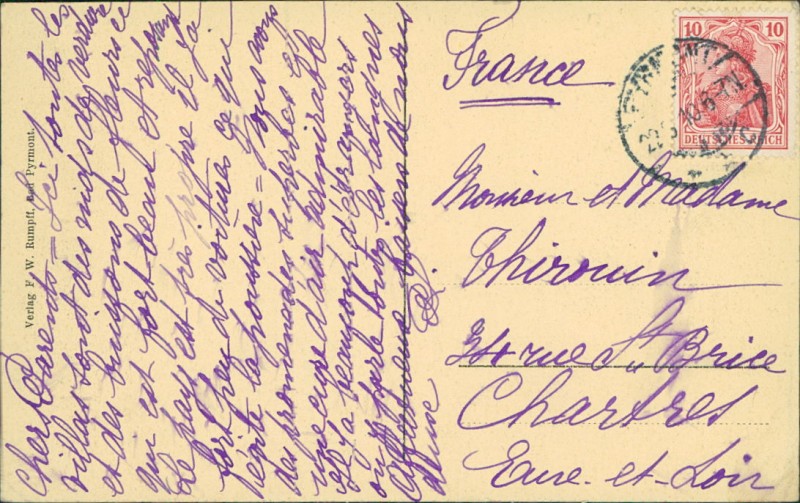 Alte Ansichtskarte aus Bad Pyrmont, gelaufen am 22.06.1910 von Pyrmont nach Chartres.