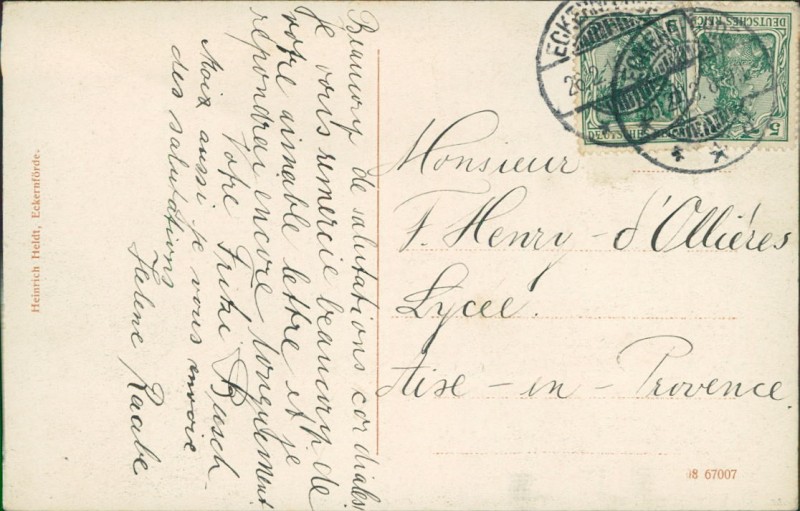 Alte Ansichtskarte aus Eckernförde, gelaufen am 26.02.1918 von Eckernförde nach Aix-en-Provence.