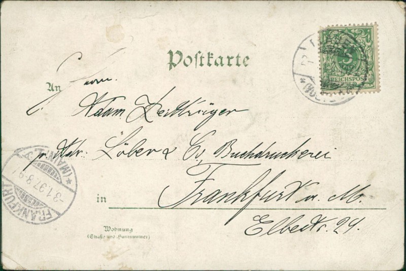 Alte Ansichtskarte aus Plauen, gelaufen am 02.01.1897 von Plauen nach Frankfurt a. M. Ankunft in Frankfurt a. M. am 03.01.1897.