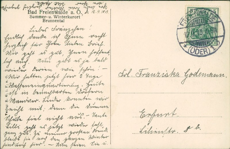 Alte Ansichtskarte aus Bad Freienwalde (Oder), gelaufen am 12.09.1913 von Freienwalde (Oder) nach Erfurt.