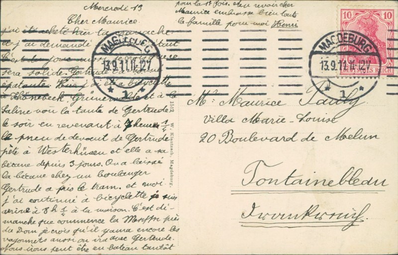 Alte Ansichtskarte aus Magdeburg, gelaufen am 13.09.1911 von Magdeburg nach Fontaineblau.