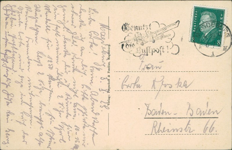 Alte Ansichtskarte aus Magdeburg, gelaufen am 04.10.1929 von Magdeburg nach Baden-Baden.
