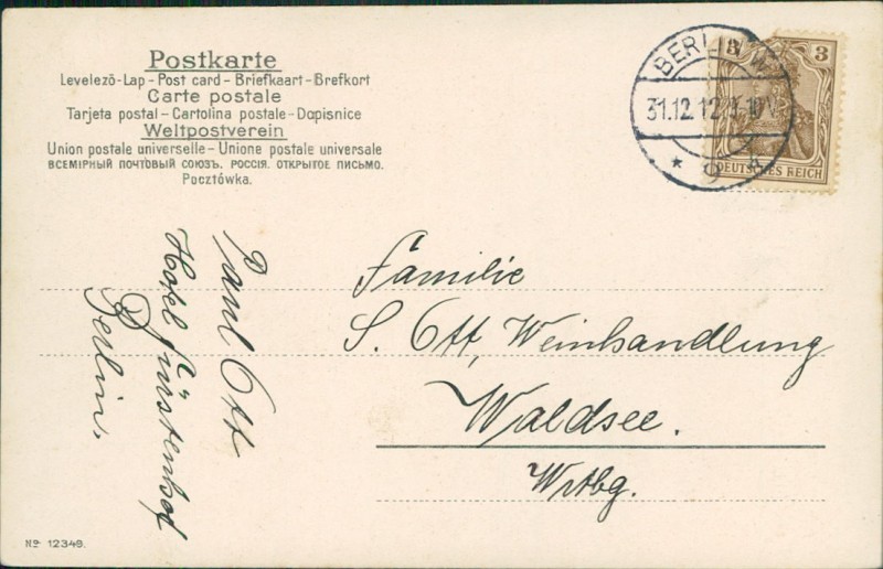 Alte Ansichtskarte, gelaufen am 31.12.1912 von Berlin nach Waldsee.