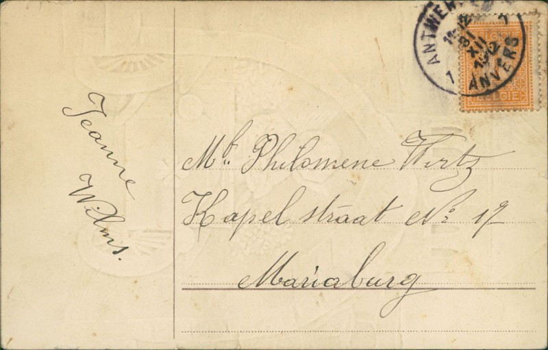 Alte Ansichtskarte, gelaufen am 31.12.1912 von Antwerpen nach Mariaburg.