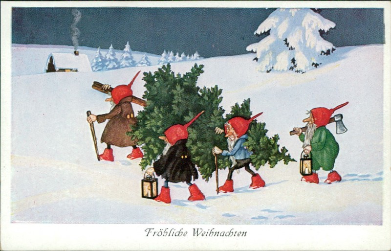 Zwerge tragen Tannenbaum nach Hause