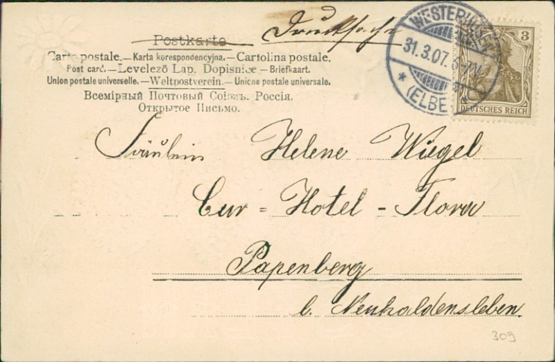 Alte Ansichtskarte, gelaufen am 31.03.1907 von Westerhusen nach Papenberg.