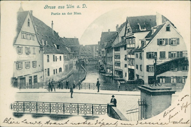 Alte Ansichtskarte aus Ulm, gelaufen am 21.06.1904 von Ulm Bahnhof nach Brüssel.