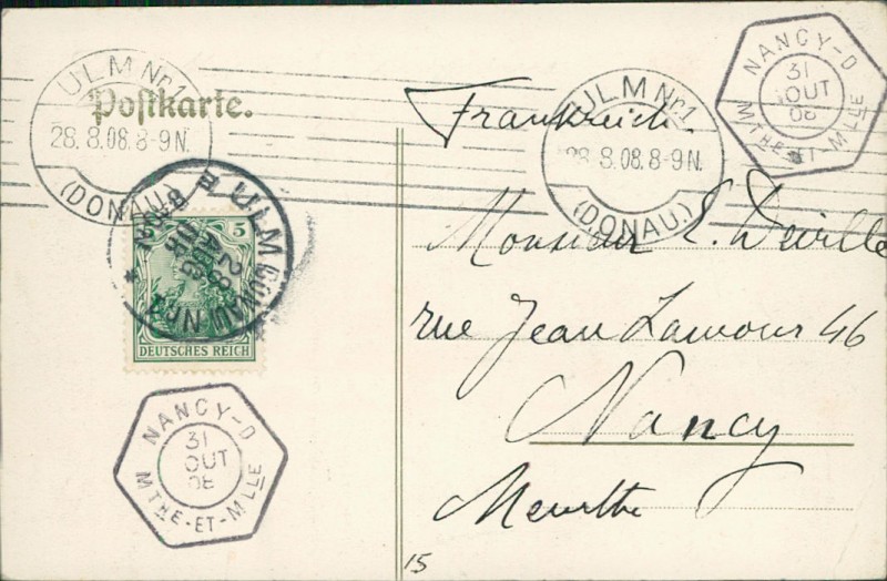 Alte Ansichtskarte aus Ulm, gelaufen am 08.08.1908 von Ulm (Donau) nach Nancy.