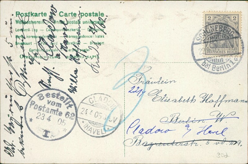 Alte Ansichtskarte, gelaufen am 22.04.1905 von Schöneberg bei Berlin nach Cladow (Havel). Ankunft in Cladow (Havel) am 24.04.1905.