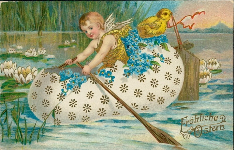 Engelchen mit Kücken im Osterei-Kahn