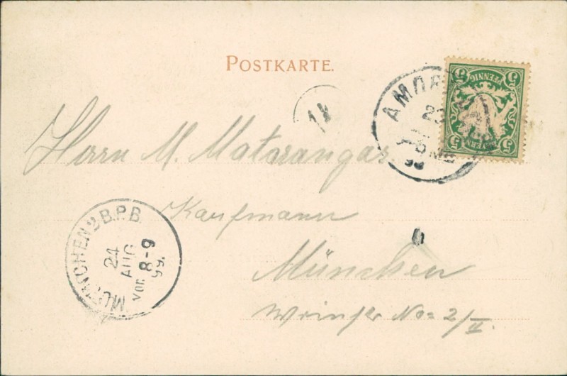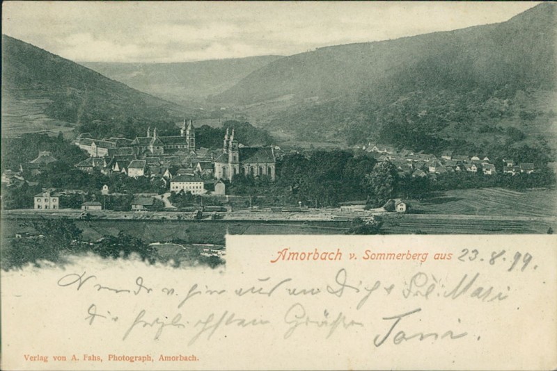Alte Ansichtskarte aus Amorbach, gelaufen am 23.08.1899 von Amorbach nach München. Ankunft in München am 24.08.1899.