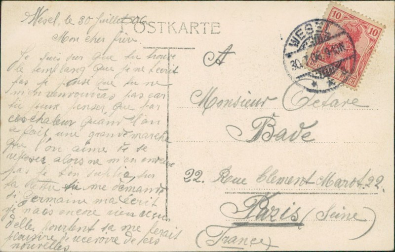 Alte Ansichtskarte aus Wesel, gelaufen am 30.07.1906 von Wesel nach Paris.