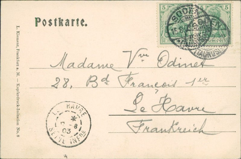 Alte Ansichtskarte aus Bad Soden am Taunus, gelaufen am 15.08.1903 von Soden (Taunus) nach Le Havre. Ankunft in Le Havre am 17.08.1903.