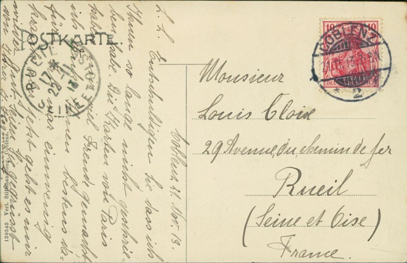 Alte Ansichtskarte aus Koblenz, gelaufen am 21.11.1913 von Coblenz nach Rueil. Ankunft in Rueil am 22.11.1913.
