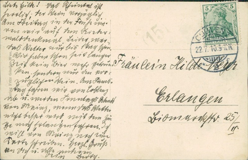 Alte Ansichtskarte aus Koblenz, gelaufen am 22.07.1910 von Coblenz nach Erlangen.