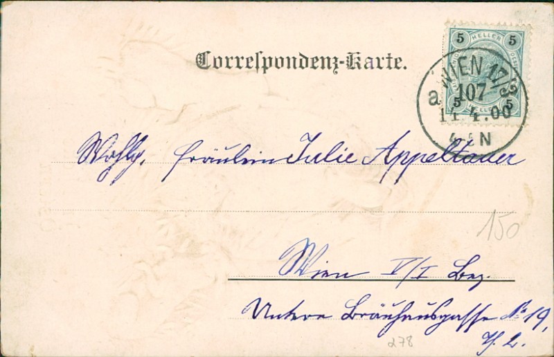 Alte Ansichtskarte, gelaufen am 14.04.1900 von Wien nach Wien.