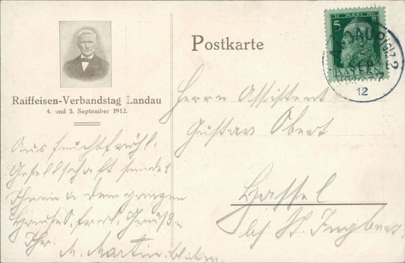 Festhalle, rückseitig Eindruck "Raiffeisen-Verbandstag Landau 4. und 5. September 1912"