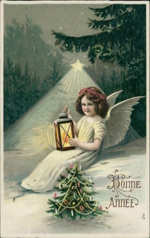 Engel mit Laterne im Wald, geschmückter Weihachtsbaum