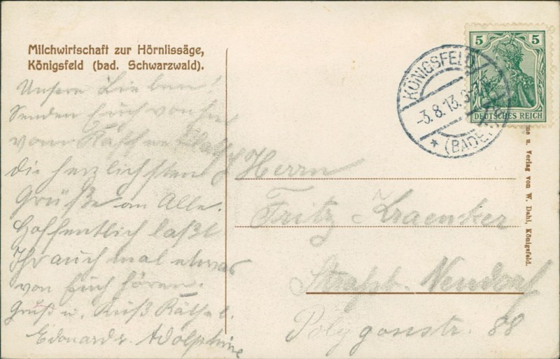 Alte Ansichtskarte aus Königsfeld im Schwarzwald, gelaufen am 03.08.1913 von Königsfeld (Baden) nach Straßb. Neudorf.