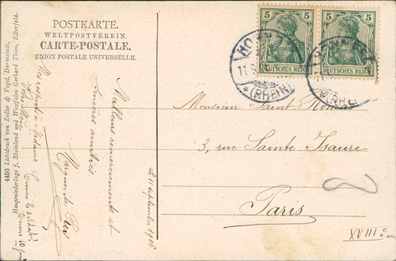 Alte Ansichtskarte aus Bad Honnef, gelaufen am 11.09.1906 von Honnef (Rhein) nach Paris.