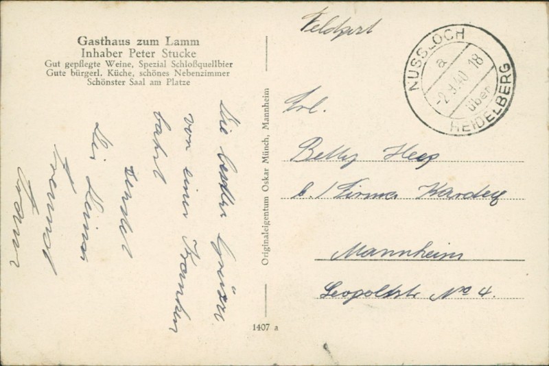 Alte Ansichtskarte aus Nußloch, gelaufen am 02.09.1940 von Nussloch über Heidelberg nach Mannheim.