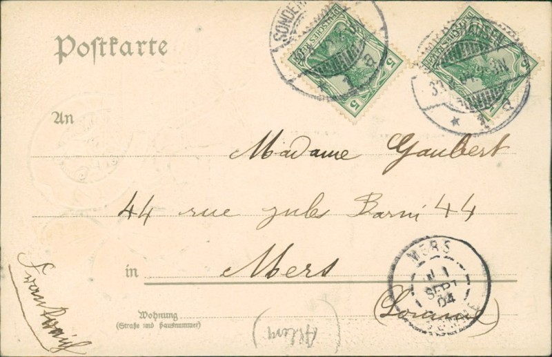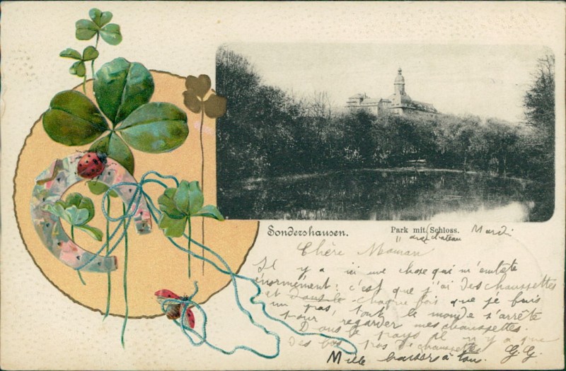 Alte Ansichtskarte aus Sondershausen, gelaufen am 31.08.1904 von Sondershausen nach Mers. Ankunft in Mers am 01.09.1904.