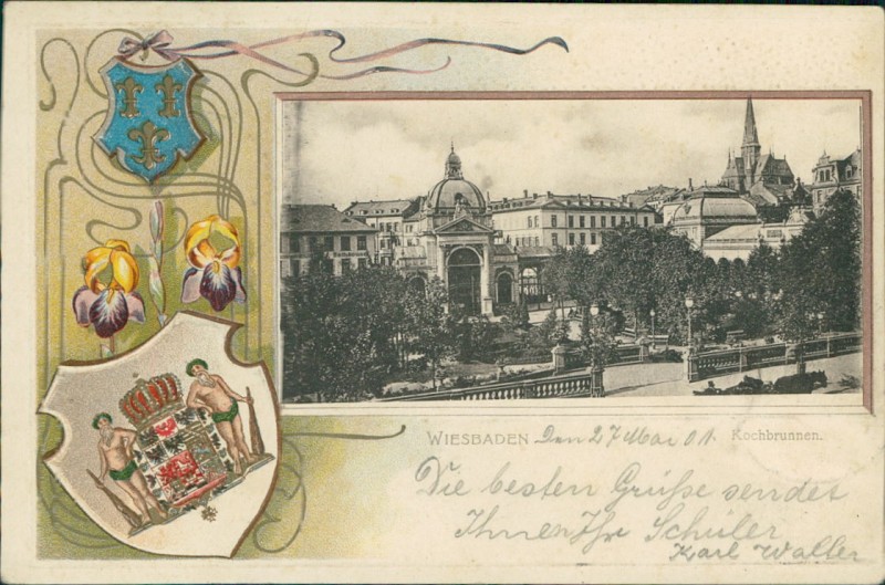 Alte Ansichtskarte aus Wiesbaden, gelaufen am 28.05.1901 von Wiesbaden nach Frankfurt.