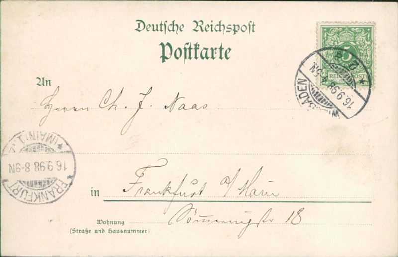 Alte Ansichtskarte aus Wiesbaden, gelaufen am 16.09.1898 von Wiesbaden nach Frankfurt a/Main. Ankunft in Frankfurt a/Main am 16.09.1898.