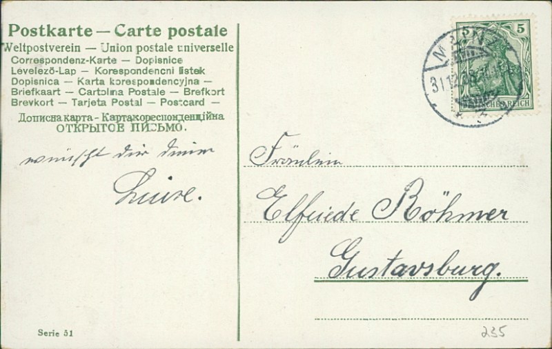 Alte Ansichtskarte, gelaufen am 31.12.1908 von Mainz nach Gustavsburg.