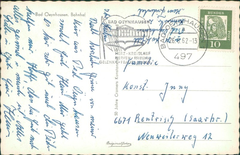 Alte Ansichtskarte aus Bad Oeynhausen, gelaufen am 26.06.1962 von Bad Oeynhausen nach Rentrisch.