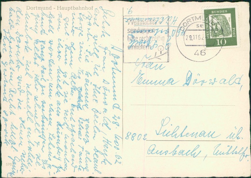 Alte Ansichtskarte aus Dortmund, gelaufen am 29.11.1962 von Dortmund nach Lichtenau.