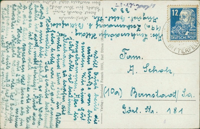 Alte Ansichtskarte aus Bitterfeld-Wolfen, gelaufen um 1950.