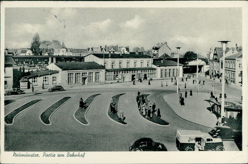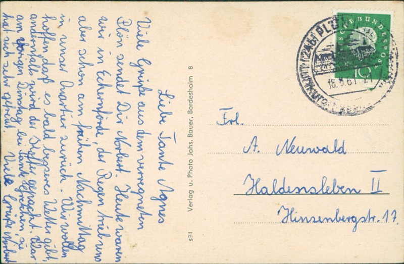 Alte Ansichtskarte aus Neumünster, gelaufen am 18.08.1961 von Plön (Holstein) nach Haldensleben.