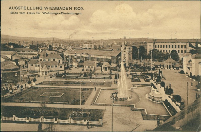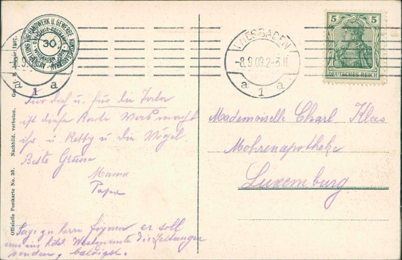 Alte Ansichtskarte aus Wiesbaden, gelaufen am 08.09.1909 von Wiesbaden nach Luxemburg.
