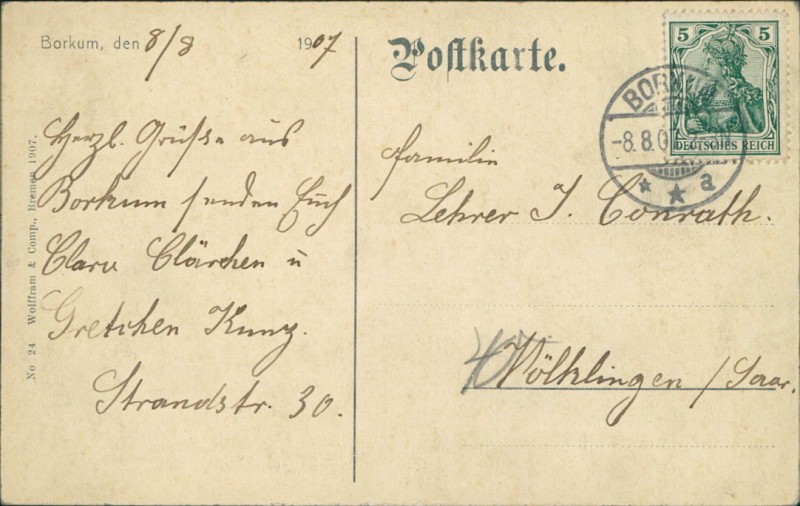 Alte Ansichtskarte aus Borkum, gelaufen am 08.08.1907 von Borkum nach Völklingen.