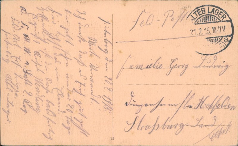 Alte Ansichtskarte aus Münsingen, gelaufen am 21.02.1915 von Altes Lager nach Straßburg.