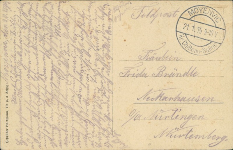 Alte Ansichtskarte aus Vic-sur-Seille, gelaufen am 21.01.1915 von Moyenvic nach Nürtingen.