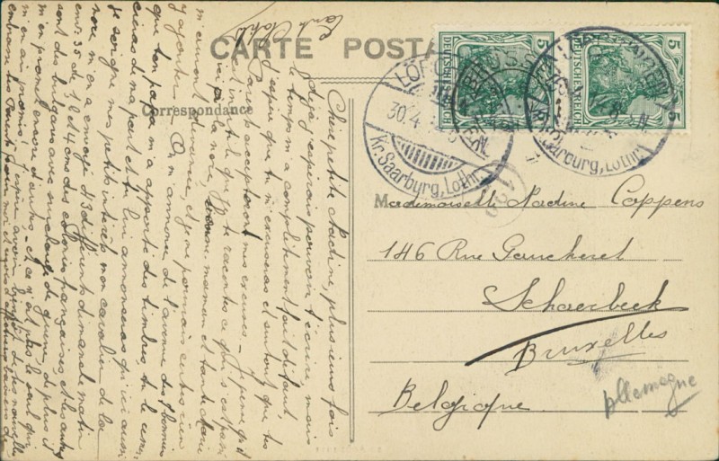 Alte Ansichtskarte aus Lorquin / Lörchingen, gelaufen am 30.04.1914 von Lörchingen nach Schaerbeek.