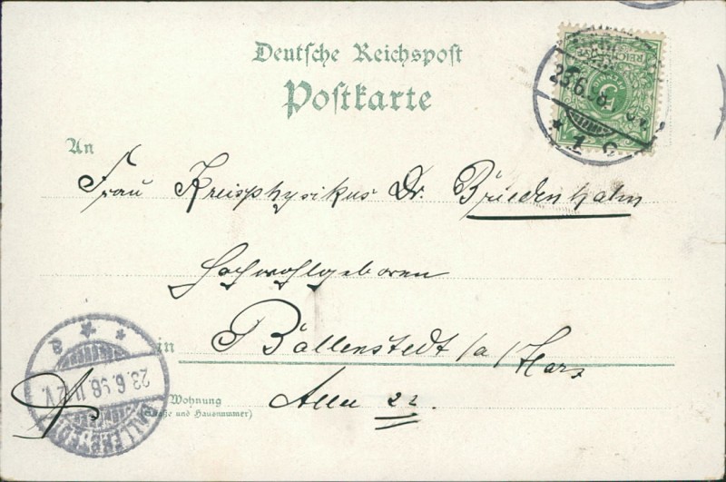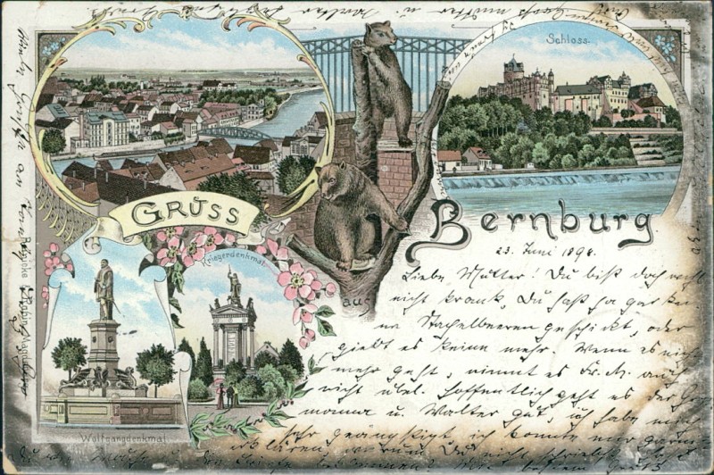 Alte Ansichtskarte aus Bernburg (Saale), gelaufen am 23.06.1898 von Bernburg nach Ballenstedt. Ankunft in Ballenstedt am 23.06.1898.
