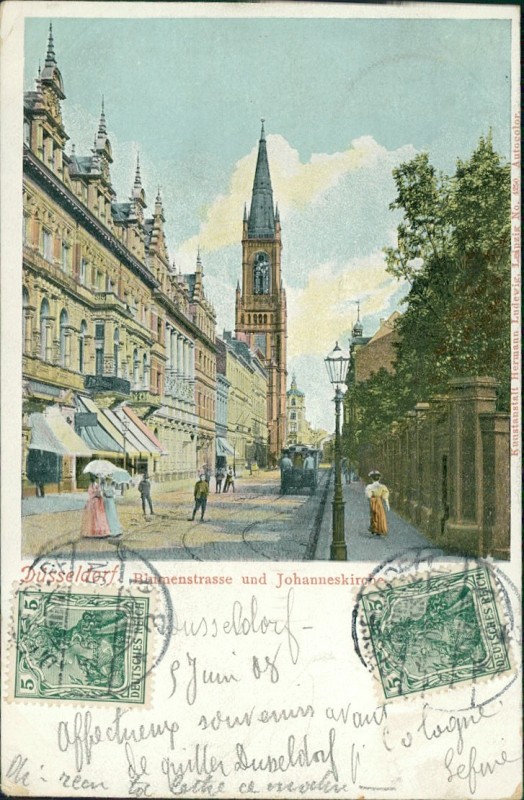 Alte Ansichtskarte aus Düsseldorf, gelaufen am 05.06.1908 von Düsseldorf nach Toul. Ankunft in Toul am 06.06.1908.