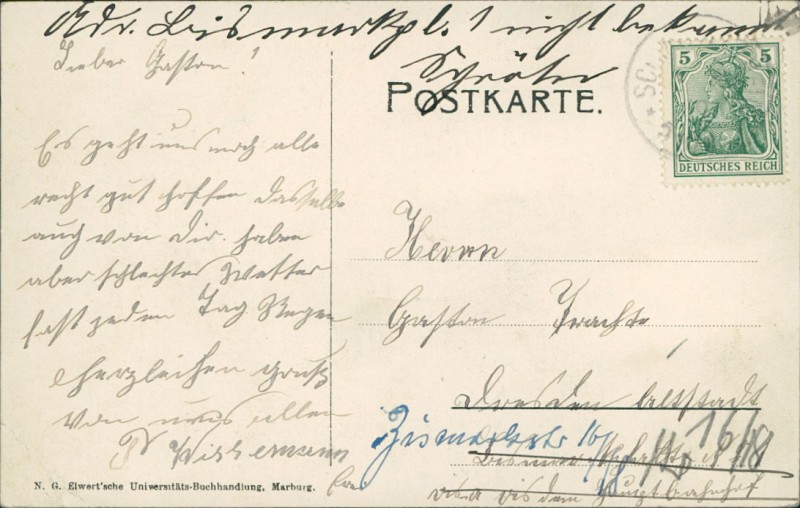 Alte Ansichtskarte aus Marburg, gelaufen um 1907.