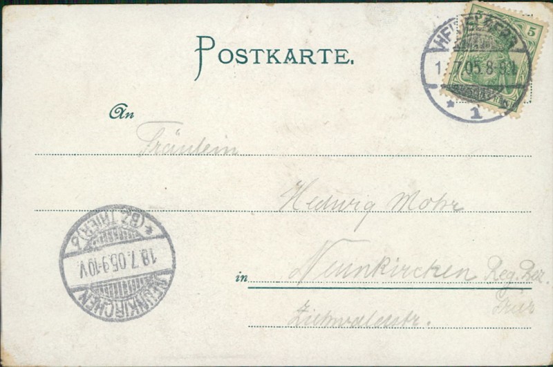 Alte Ansichtskarte aus Heidelberg, gelaufen am 17.07.1905 von Heidelberg nach Neunkirchen (Bz. Trier). Ankunft in Neunkirchen (Bz. Trier) am 18.07.1905.